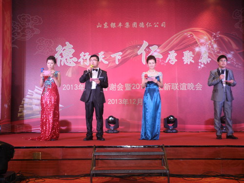 2013年12月21日下午16時,山東德仁經(jīng)濟貿(mào)易有限公司2013年“德行天下 仁厚聚親”廠商答謝會暨2014年新春聯(lián)誼晚會于藍海大酒店藍海大廳如期召開。本次大會到會廠商、經(jīng)銷商代表及社會各界來賓共計130余人,銀豐集團董事長王偉先生、金融投資事業(yè)部總經(jīng)理趙曉陽先生、總經(jīng)理助理張伊辰女士、德仁公司總經(jīng)理朱倩女士等領(lǐng)導(dǎo)出席了答謝會。