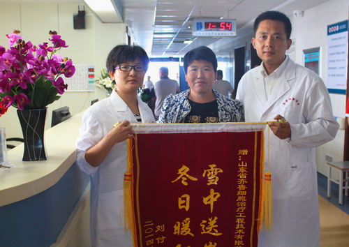 2014年8月14日上午,在醫(yī)院腫瘤科完成自體血液采集工作后,患者劉某家屬解女士激動地向山東省齊魯細胞治療工程技術有限公司相關人員及醫(yī)院腫瘤科全體醫(yī)護人員敬獻了旌旗,表達謝意。