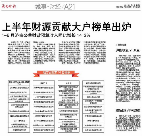 近日,濟南市政府公布了2013年上半年駐濟企業(yè)財源貢獻排行,并確定75家納稅單位為2013年上半年濟南市財源建設(shè)突出貢獻單位。其中,在地方貢獻前10名榜單中,銀豐集團下屬的山東省齊魯干細胞工程有限公司名列地方貢獻增長較快企業(yè)第六名。干細胞公司持續(xù)穩(wěn)定的納稅增長與銀豐集團回饋社會的企業(yè)精神相契合。不僅鞏固和壯大了全市財力資源,而且對促進全市財政收入穩(wěn)定增長,支持社會經(jīng)濟發(fā)展,具有特殊而重要的意義。